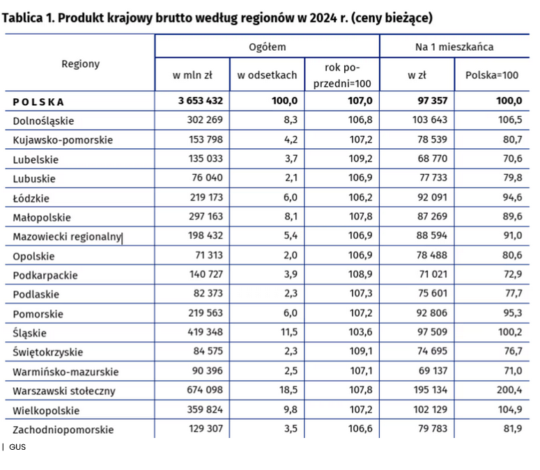 W porównaniu z 2023 rokiem, największy wzrost produktu krajowego brutto, GUS odnotował w regionie lubelskim — o 9,2 proc. , a najmniejszy w regionie śląskim — o 3,6 proc.